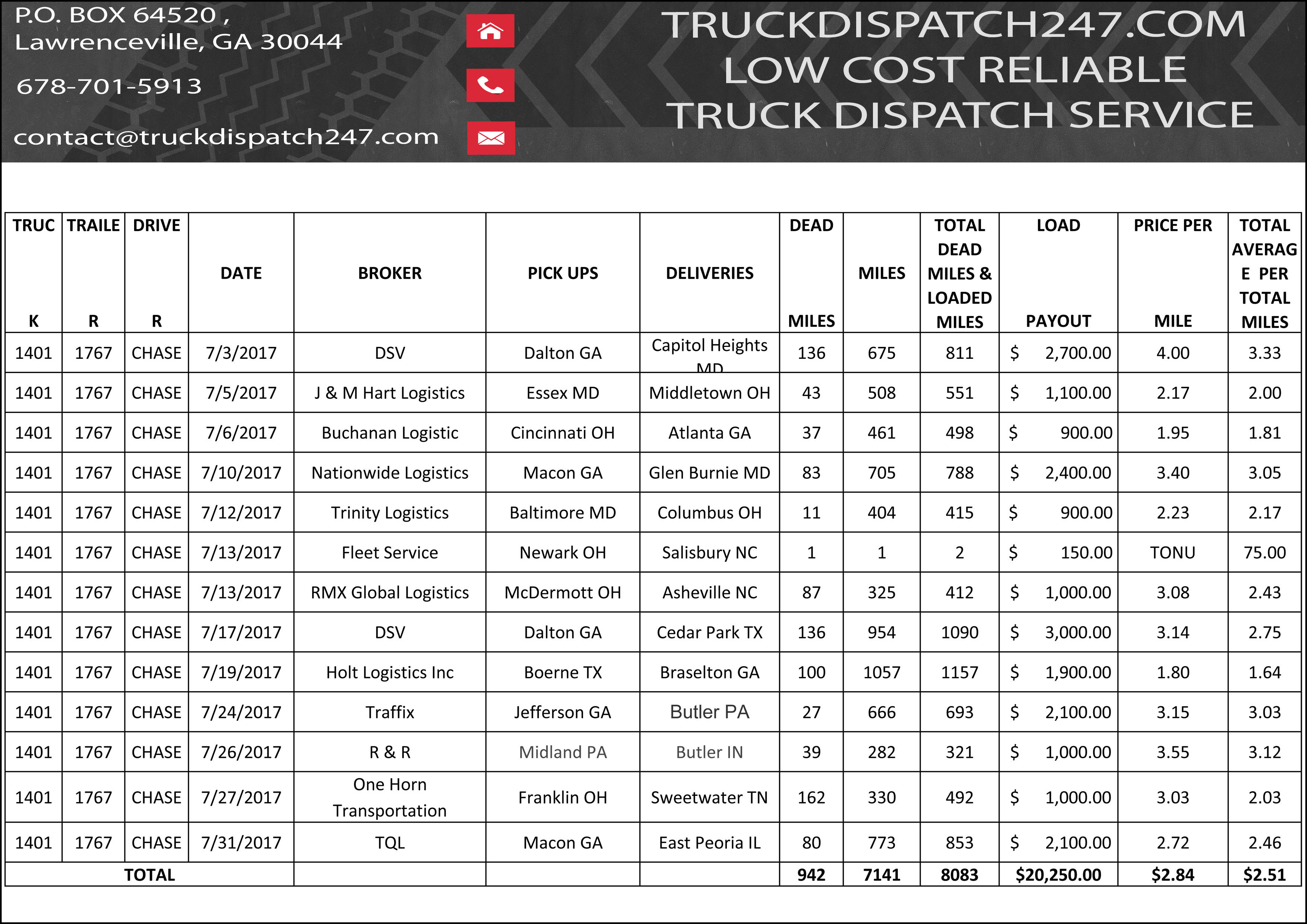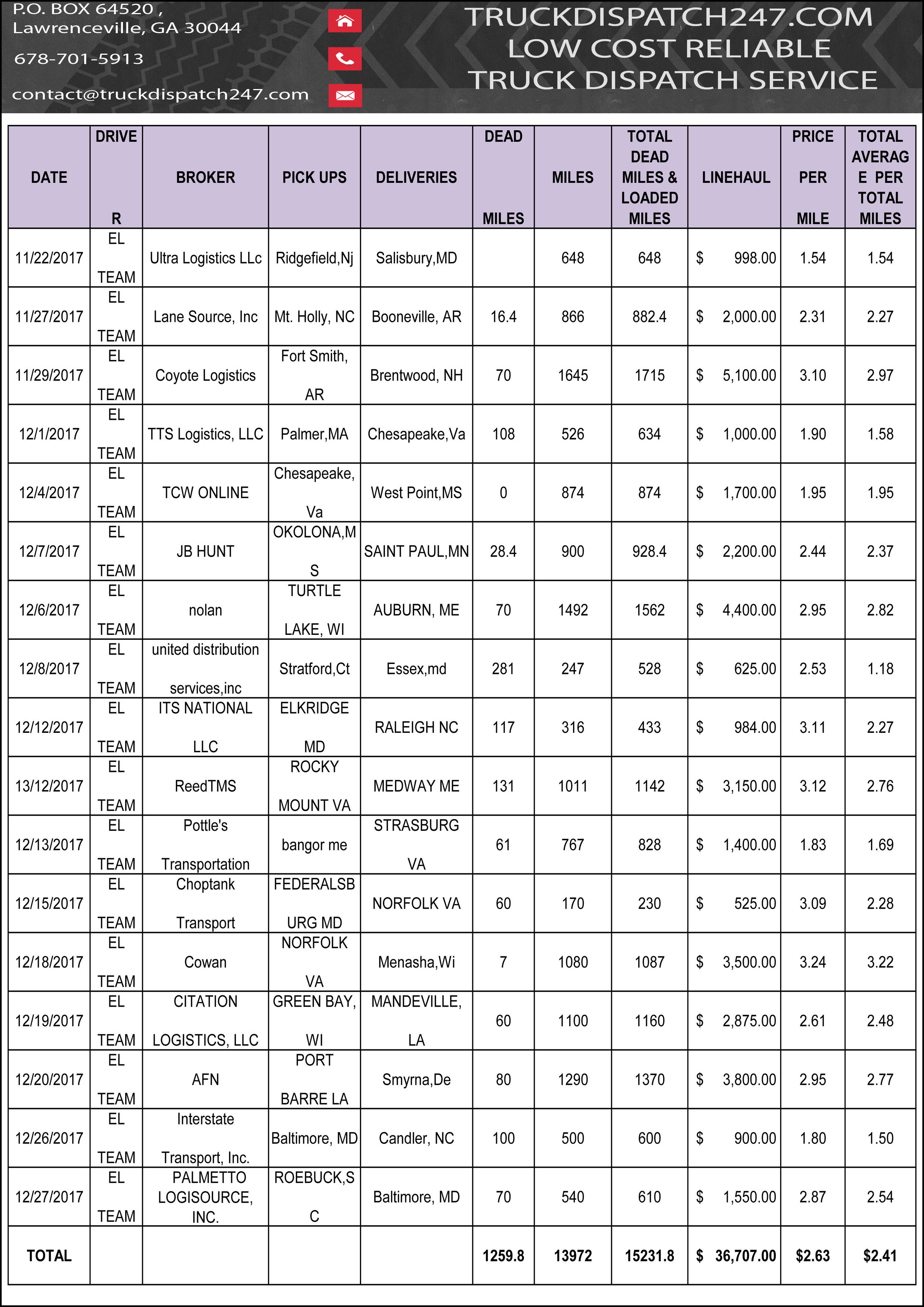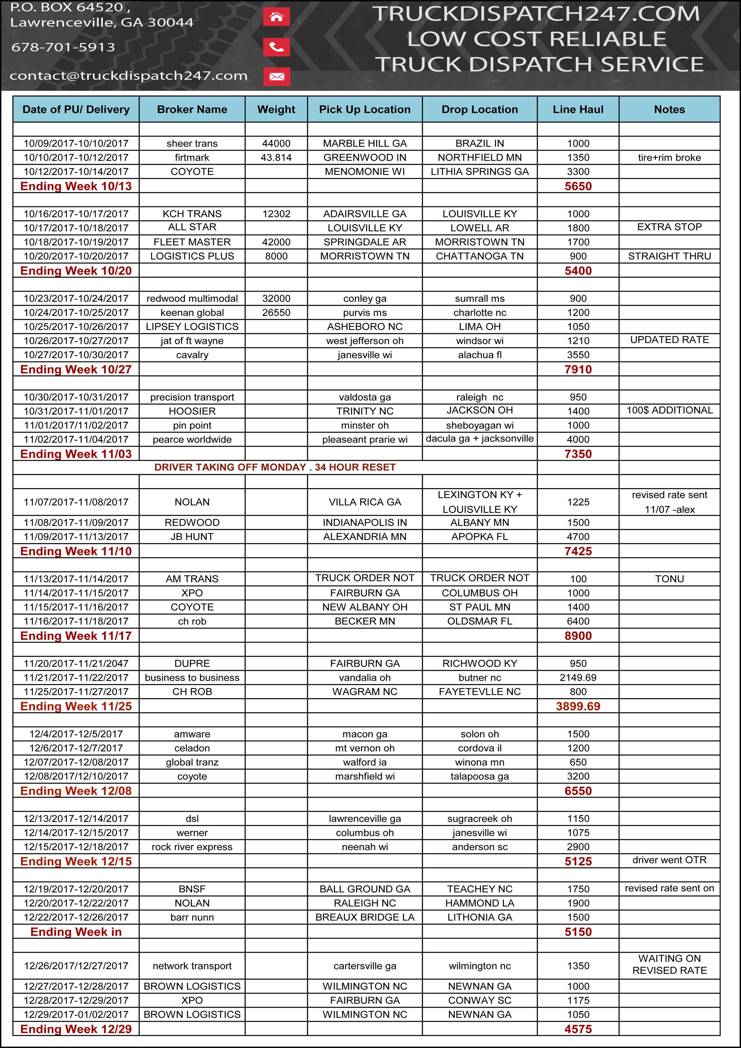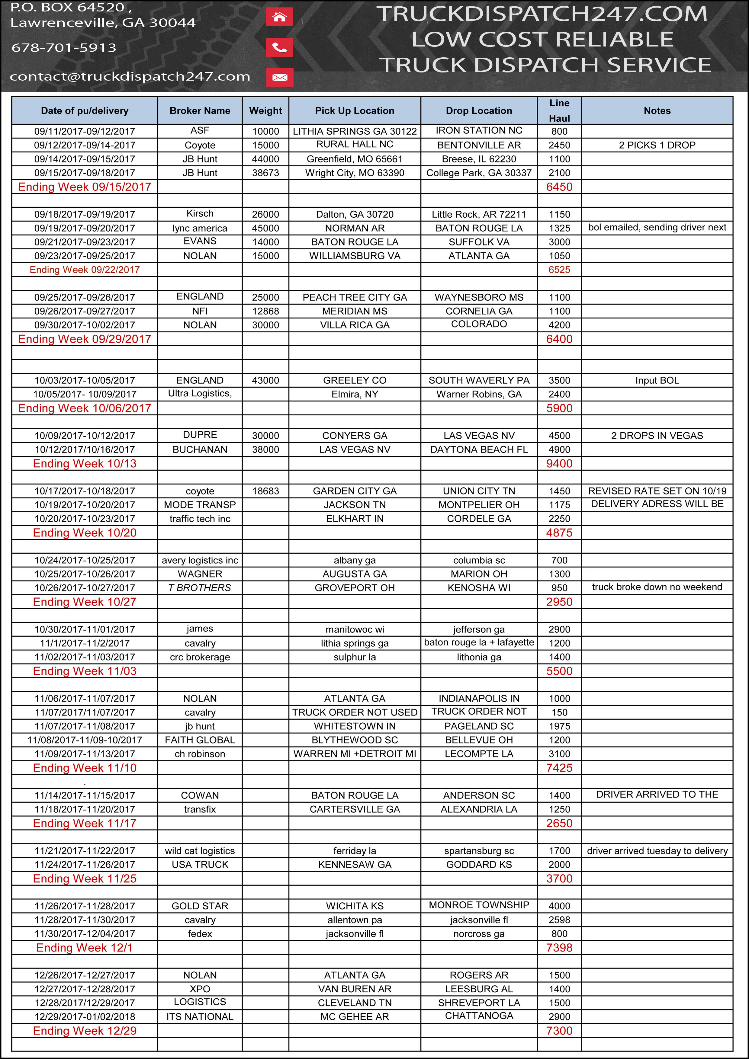 Here are some examples of great work we have provided in the last few months for our clients! All loads have been booked and verified by our professional dispatch team in close relation with the drivers, carefully , planning out the day or days for the maximum profit possible. Please take a look at the results of our work, all loads are backed up by rate cons if further proof is needed, please do not hesitate to contact us!!