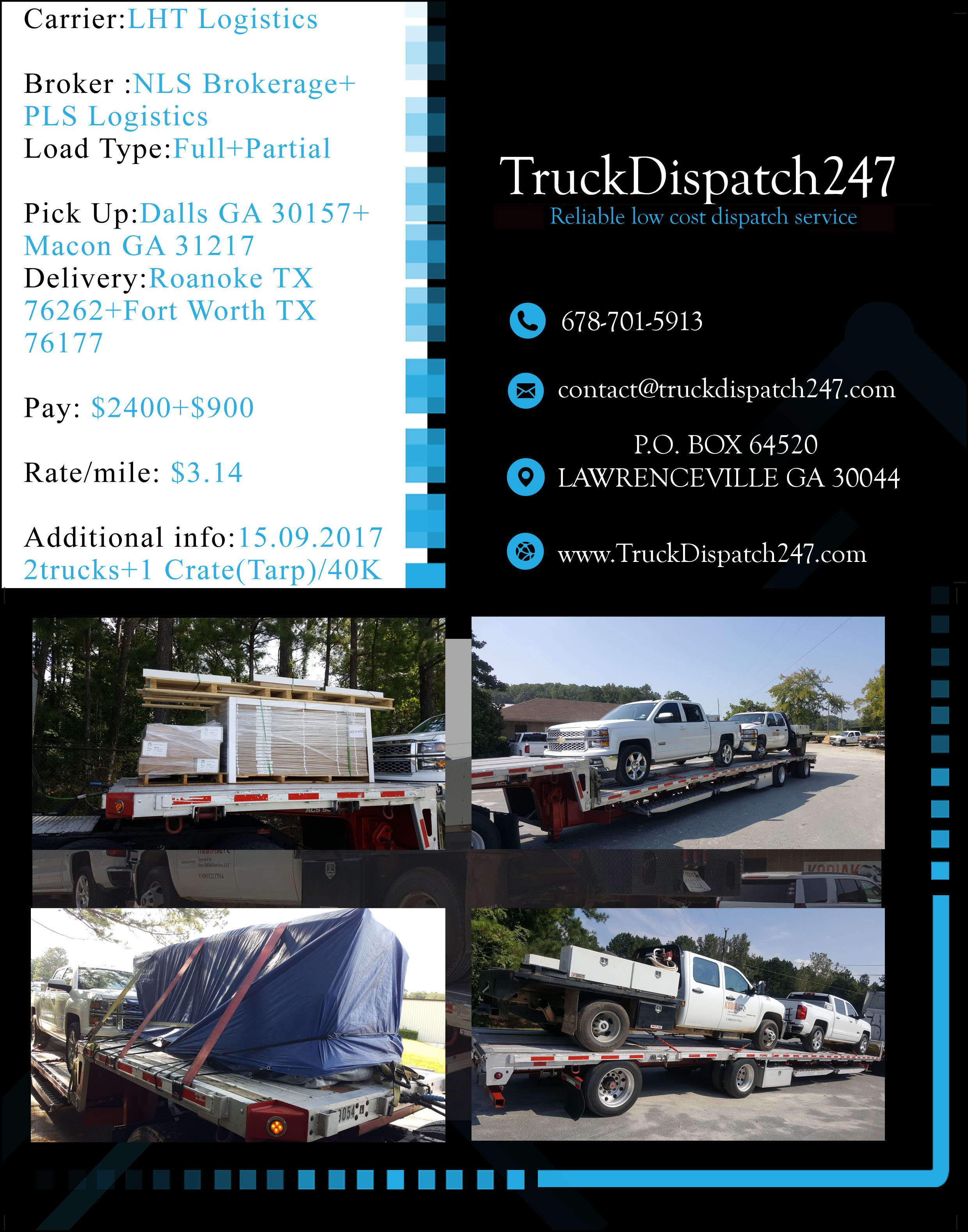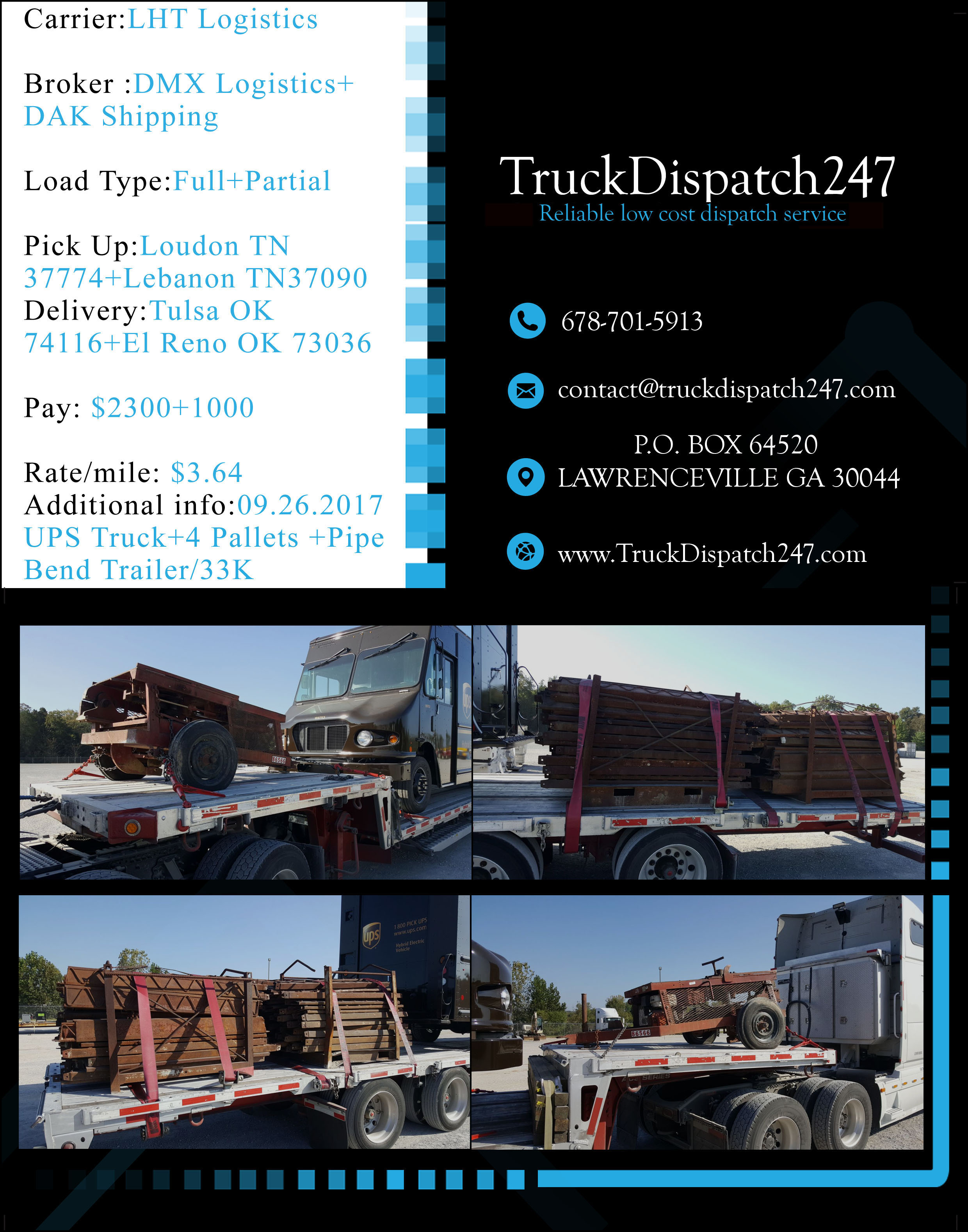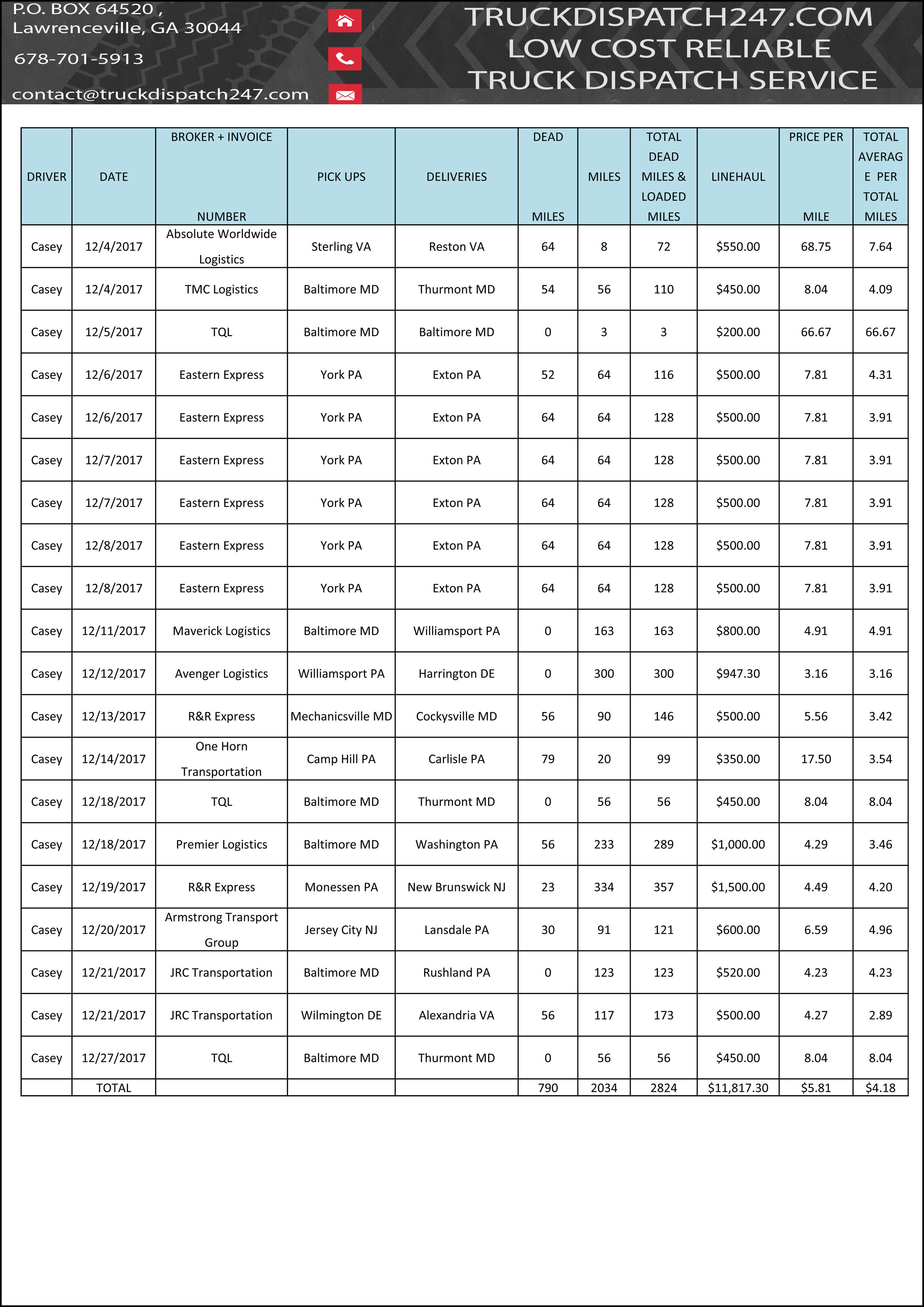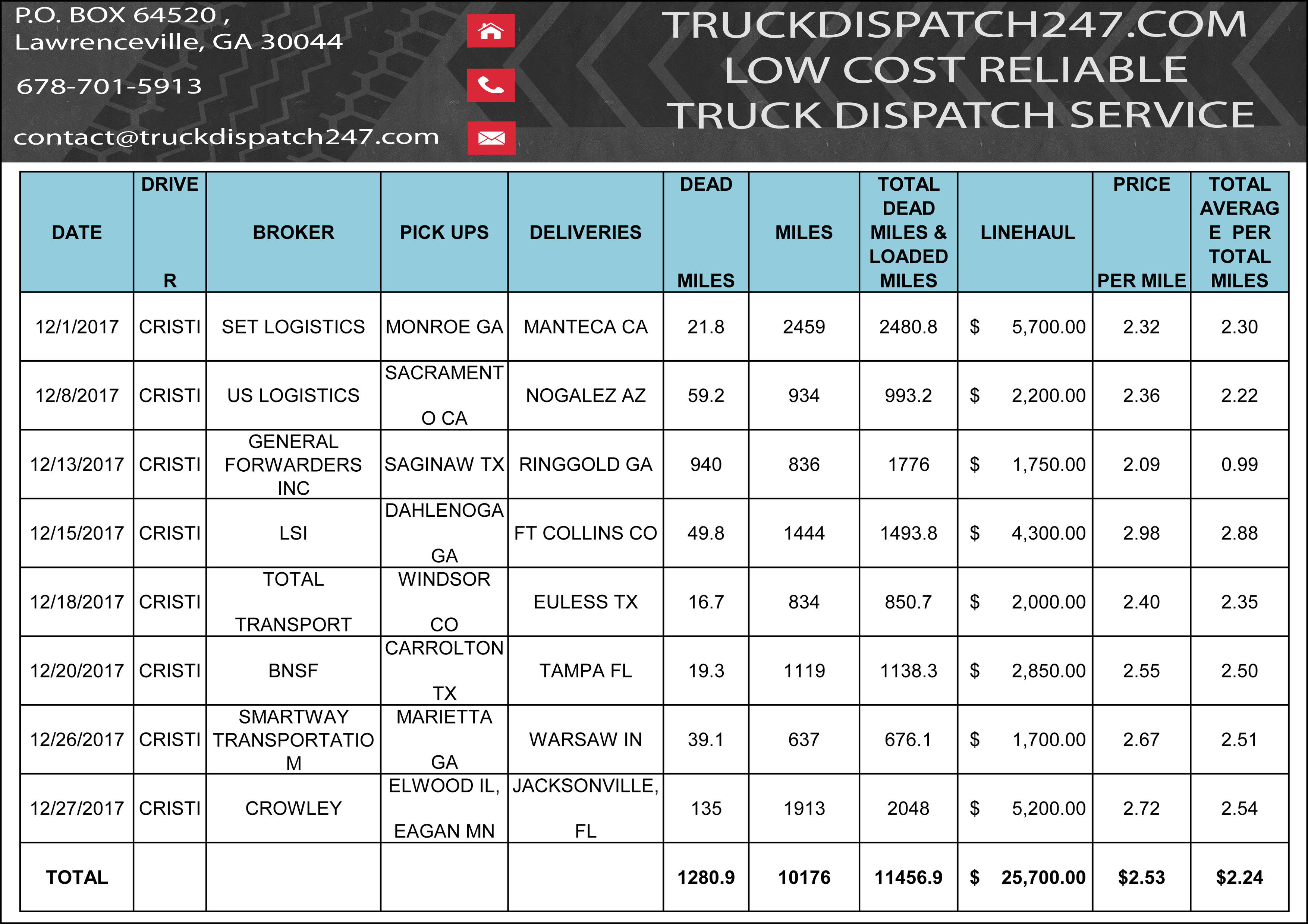 Here are some examples of great work we have provided in the last few months for our clients! All loads have been booked and verified by our professional dispatch team in close relation with the drivers, carefully , planning out the day or days for the maximum profit possible. Please take a look at the results of our work, all loads are backed up by rate cons if further proof is needed, please do not hesitate to contact us!!